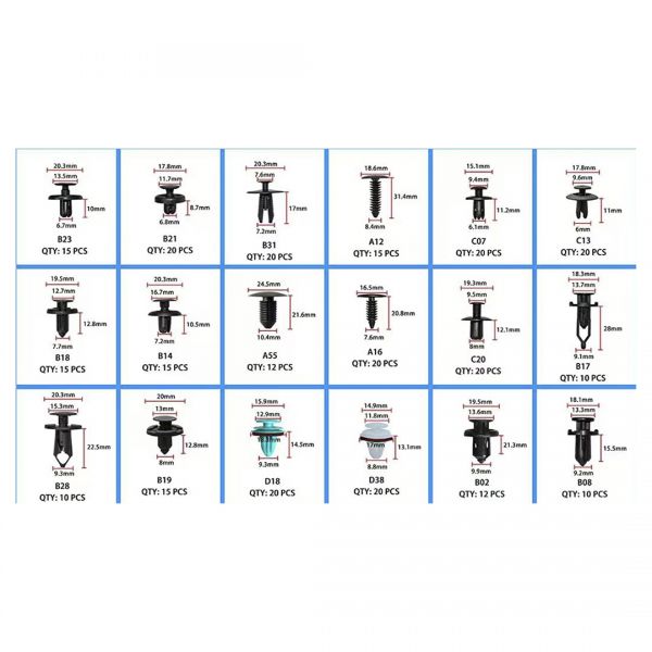 El kit de 299 pinches de KOJIMA incluye 18 tipos diferentes de sujetadores, diseñado para mantener en su lugar elementos no estructurales de tu vehículo, garantizando un acabado firme, seguro y ordenado. Ideal para talleres, mantenimiento doméstico o trabajos profesionales de automoción.