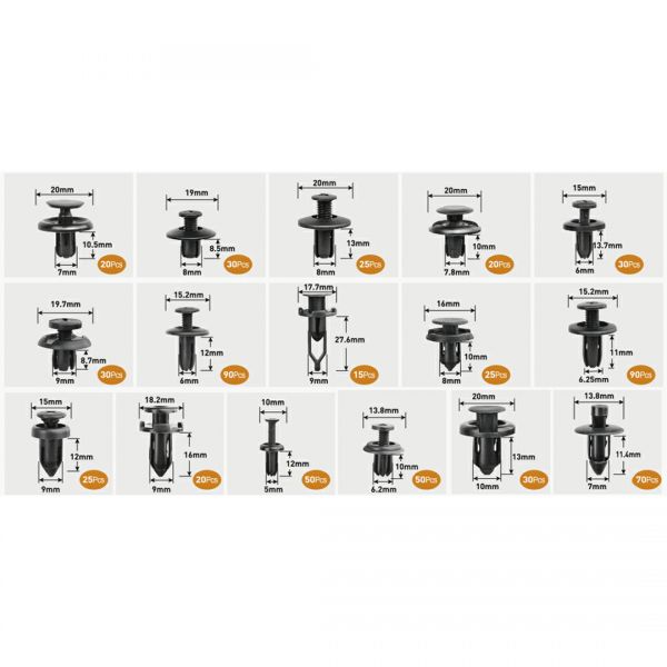 El kit de 620 pinches incluye 16 tipos diferentes, ideales para sujetar elementos no estructurales en el vehículo. Son perfectos para mantener paneles de puertas, tapicería interna, componentes del motor, parachoques, guardabarros y molduras firmemente en su lugar, evitando vibraciones y asegurando un acabado profesional y seguro en cada instalación.