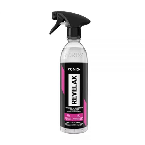 Revelax 500 ml es un revelador de hologramas desarrollado para la limpieza profunda de la carrocería del vehículo. Se utiliza al final del proceso de corrección de pintura para eliminar por completo los aceites, residuos y agentes contaminantes que dejan los compuestos de pulido, permitiendo visualizar la condición real del barniz sin enmascaramientos.